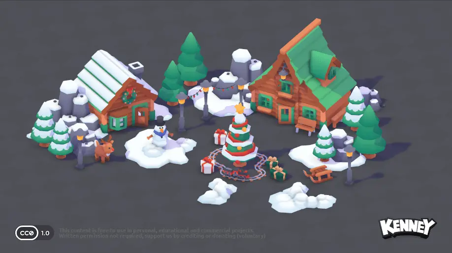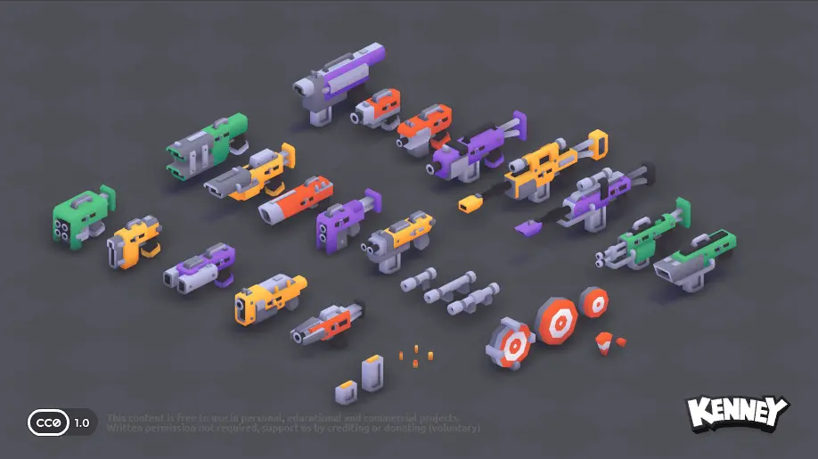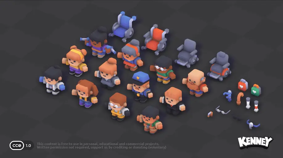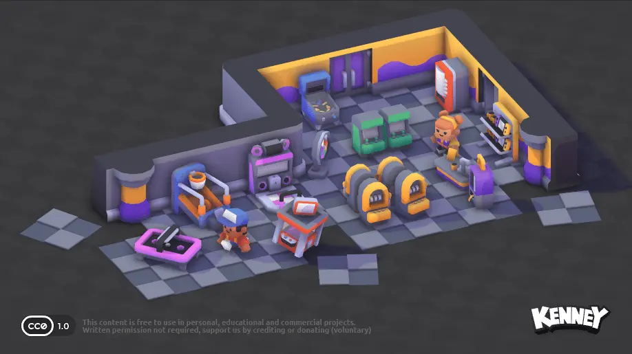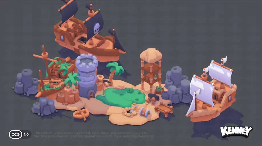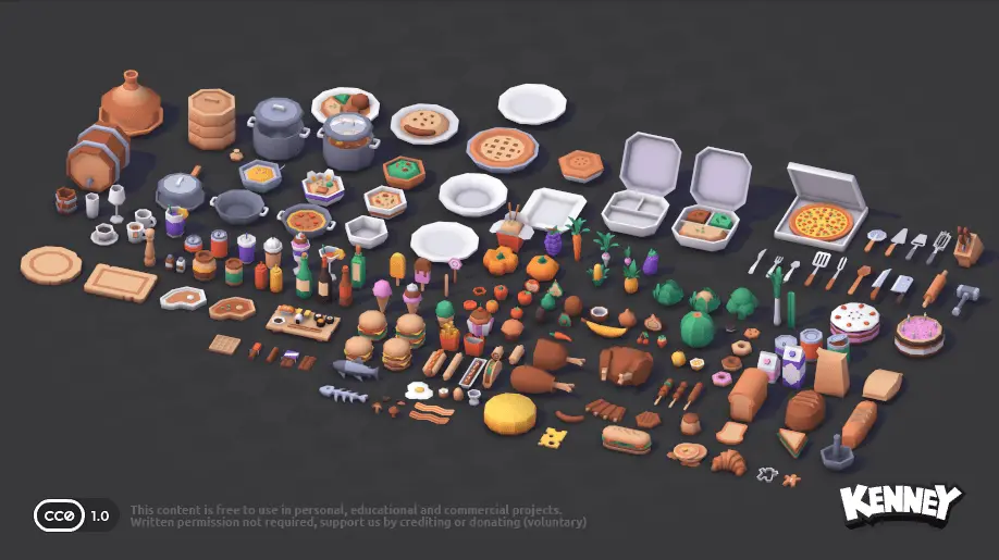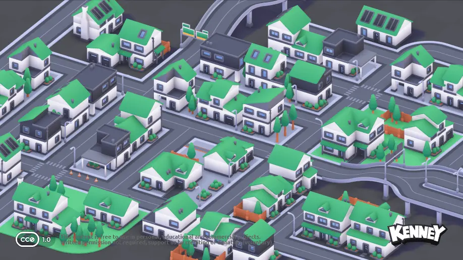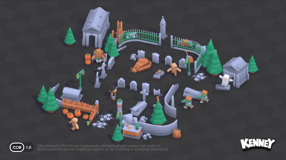 Du kannst auch 3D-Modelle in deine Szene einfügen. Auf der Website kenney.nl gibt es eine große Sammlung von kostenlosen 3D-Modellen, die du verwenden kannst. Du kannst sie direkt in dein Projekt herunterladen und in der scene.ini einfügen. Klicke dazu auf ein Kit, um die verfügbaren 3D-Modelle zu sehen: