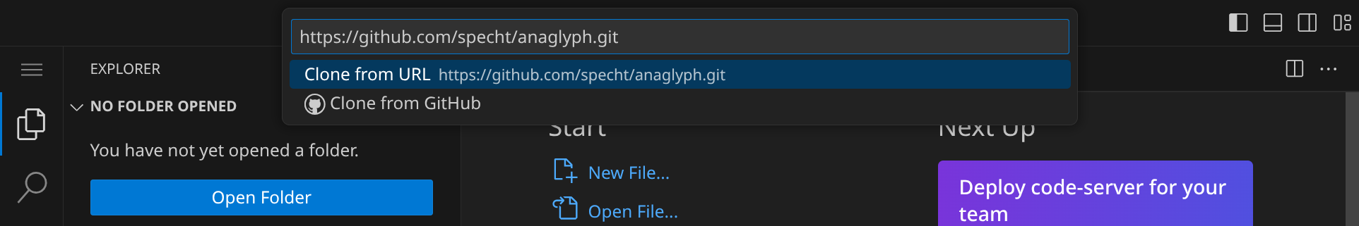Beantworte die Frage »Would you like to open the cloned repository?« mit »Open«.