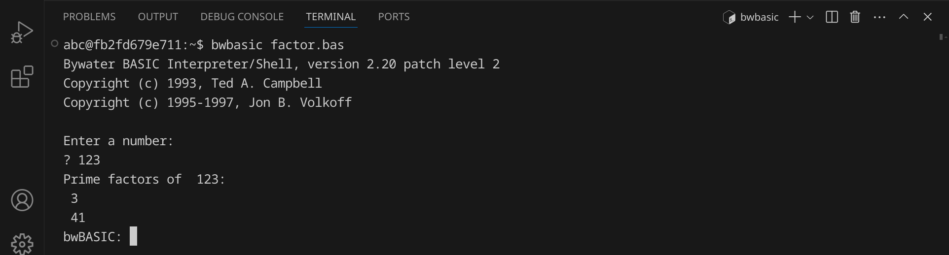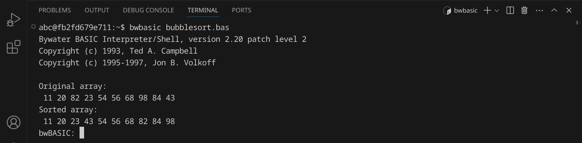 Starte nun die BASIC-Shell, indem du bwbasic eingibst und dann Enter drückst. Du solltest eine Ausgabe wie diese sehen: