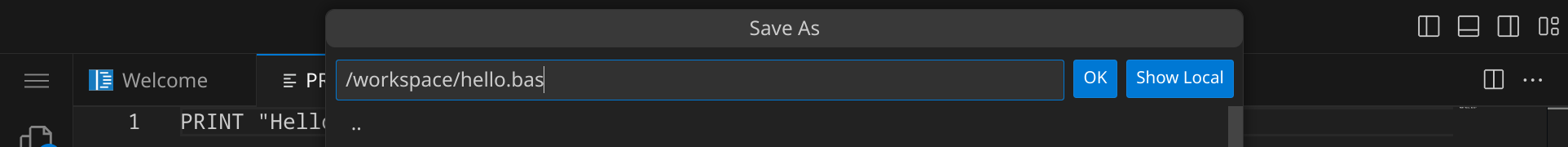 Drücke nun StrgS, um die Datei zu speichern. Gib hello.bas ein – der vollständige Pfad zu deiner Datei lautet dann /workspace/hello.bas.