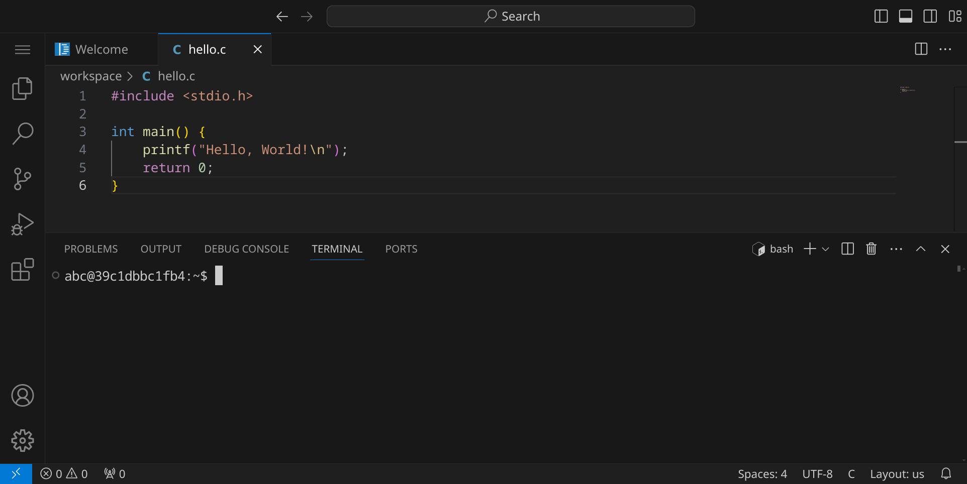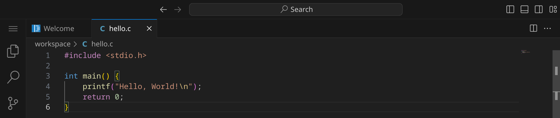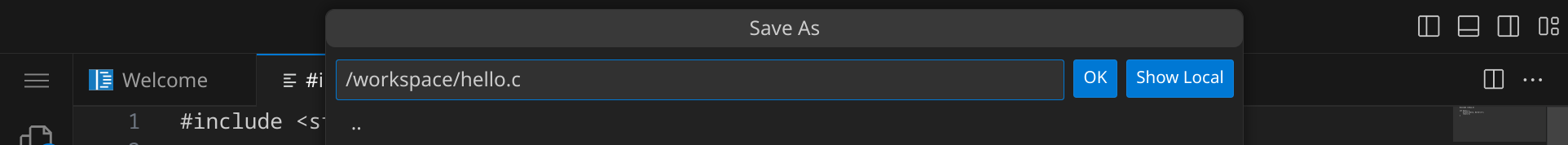Drücke nun StrgS, um die Datei zu speichern. Gib hello.c ein – der vollständige Pfad zu deiner Datei lautet dann /workspace/hello.c.