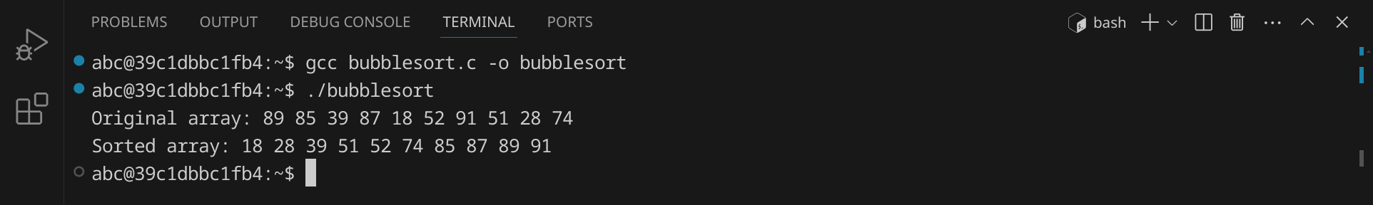 Speichere die Datei unter dem Namen bubblesort.c. Kompiliere das Programm: