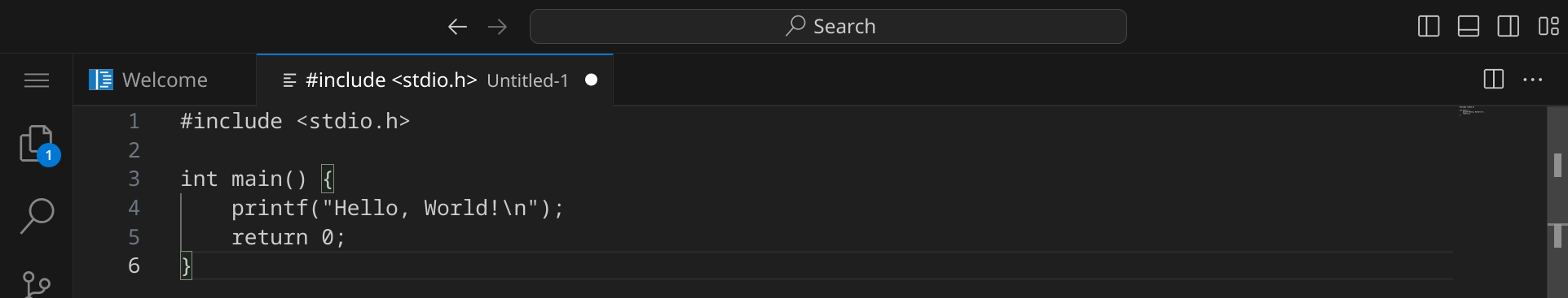 Da Visual Studio Code noch nicht weiß, dass es sich um C-Quelltext handelt, ist dein Programm momentan noch einfarbig, aber das wird sich gleich ändern. An dem weißen Punkt erkennst du, dass deine Änderungen noch nicht gespeichert sind.
