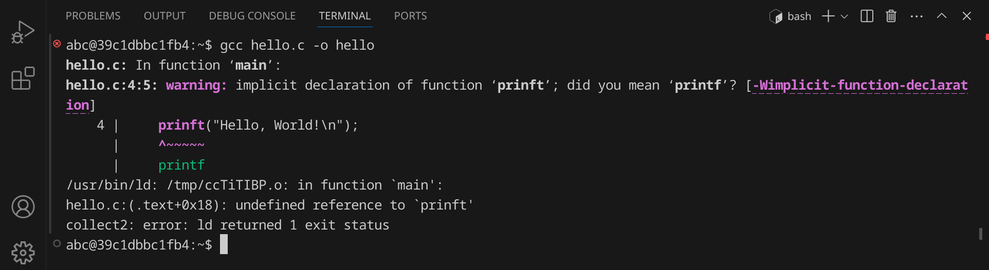Wenn du einen Fehler im Code machst, wird der Compiler eine Fehlermeldung ausgeben. Versuche zum Beispiel, statt printf das Wort prinft zu schreiben: