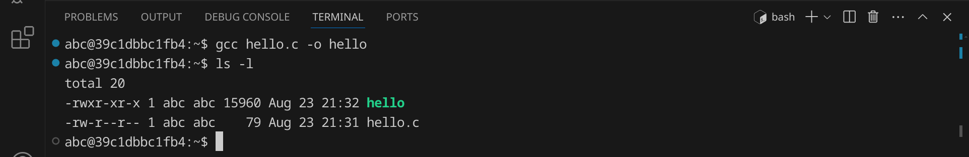 Wenn du keinen Fehler gemacht hast, wird das Programm erfolgreich kompiliert und die ausführbare Datei hello wird im selben Verzeichnis erstellt. Du kannst dies überprüfen, indem du dir die Dateien im aktuellen Verzeichnis mit ls oder ls -l anzeigen lässt: