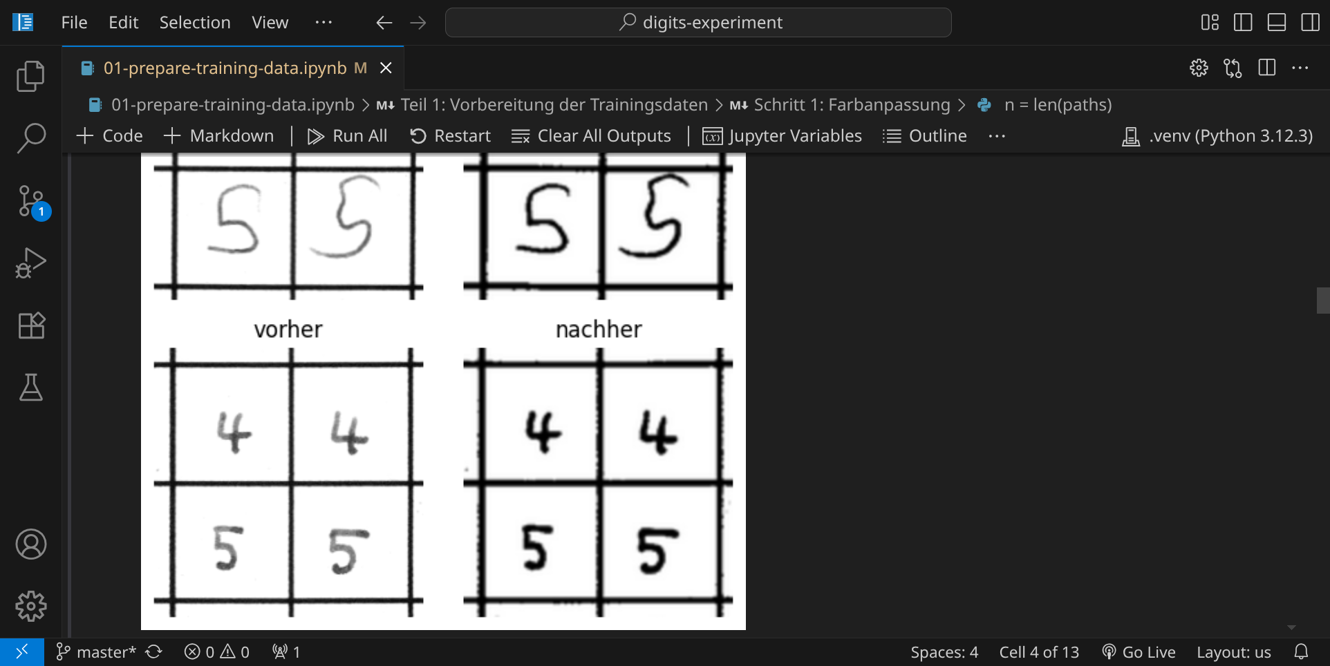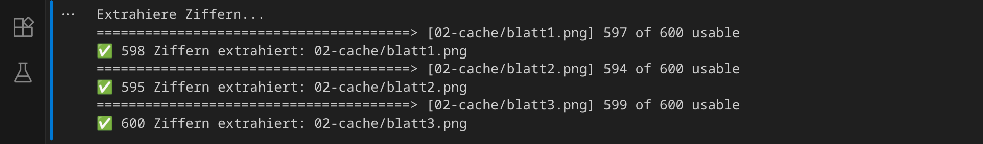Wenn das Ergebnis zufriedenstellend aussieht, führe den nächsten Codeblock aus. In diesem Schritt werden die einzelnen Ziffern aus den Bildern ausgeschnitten: