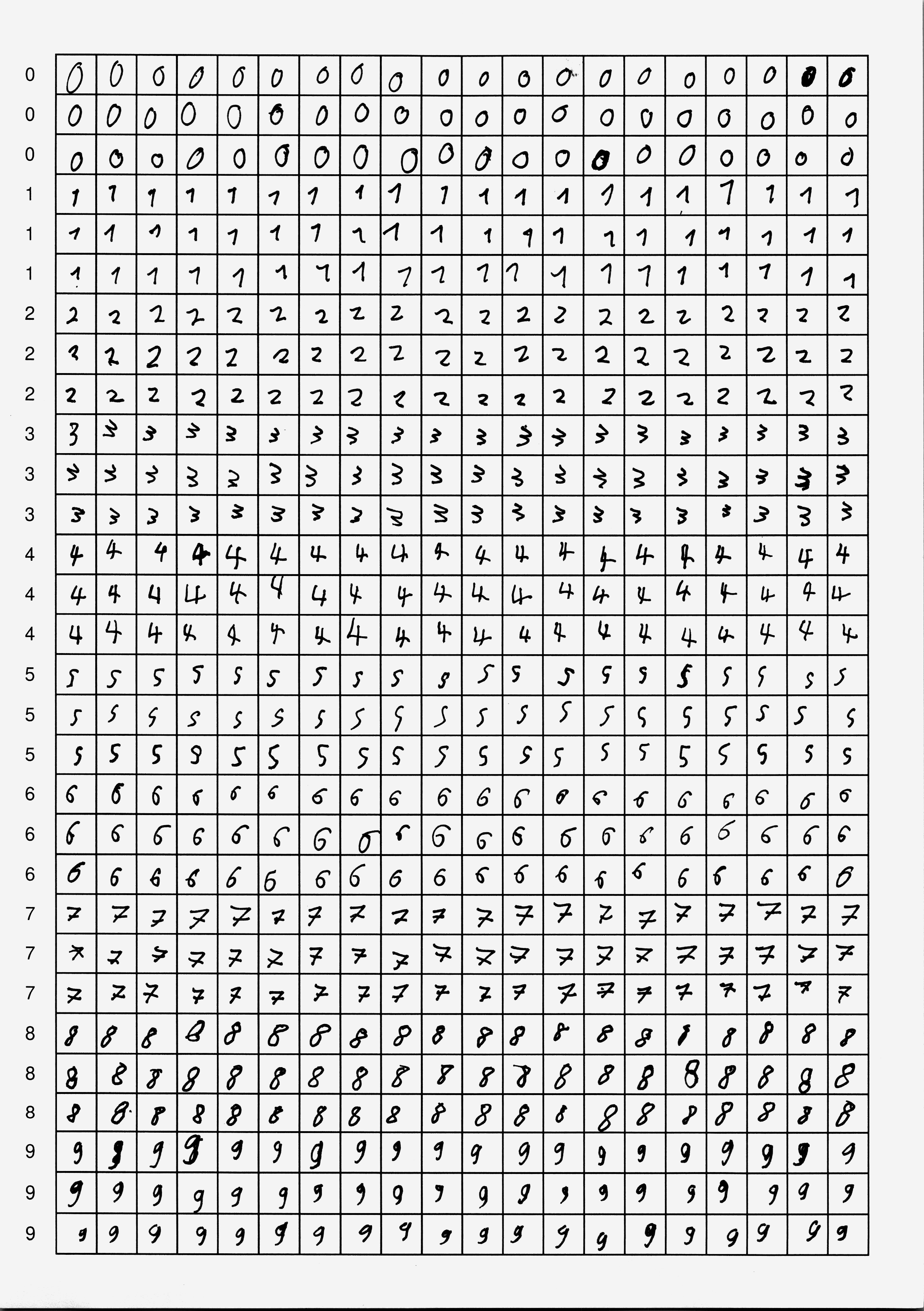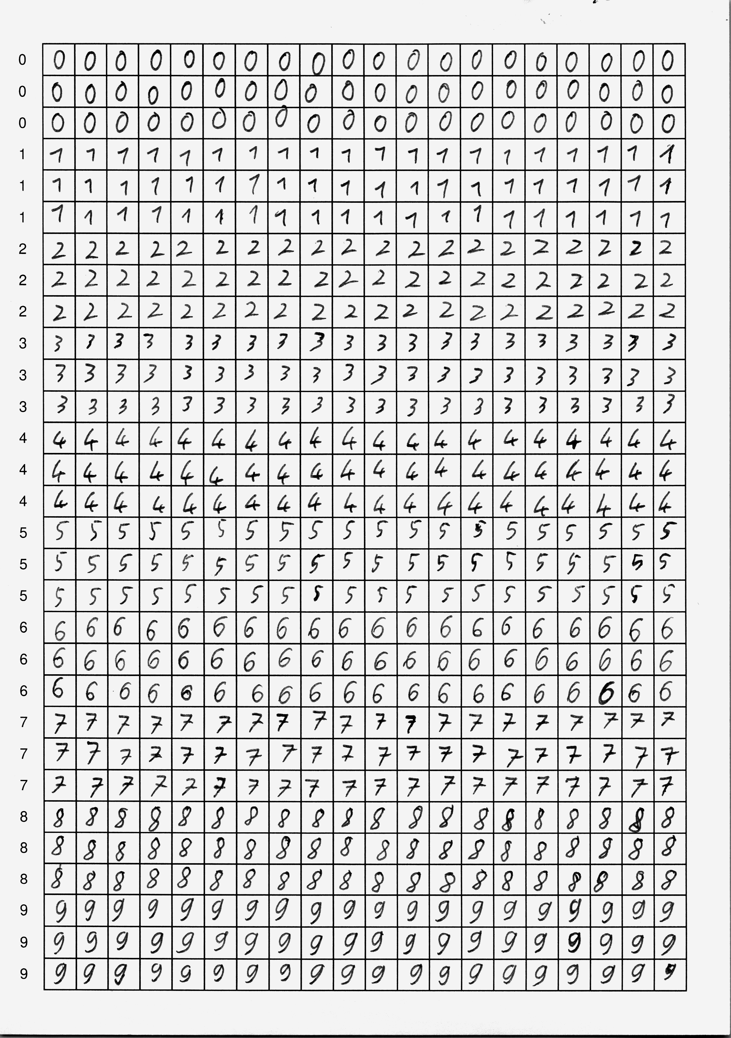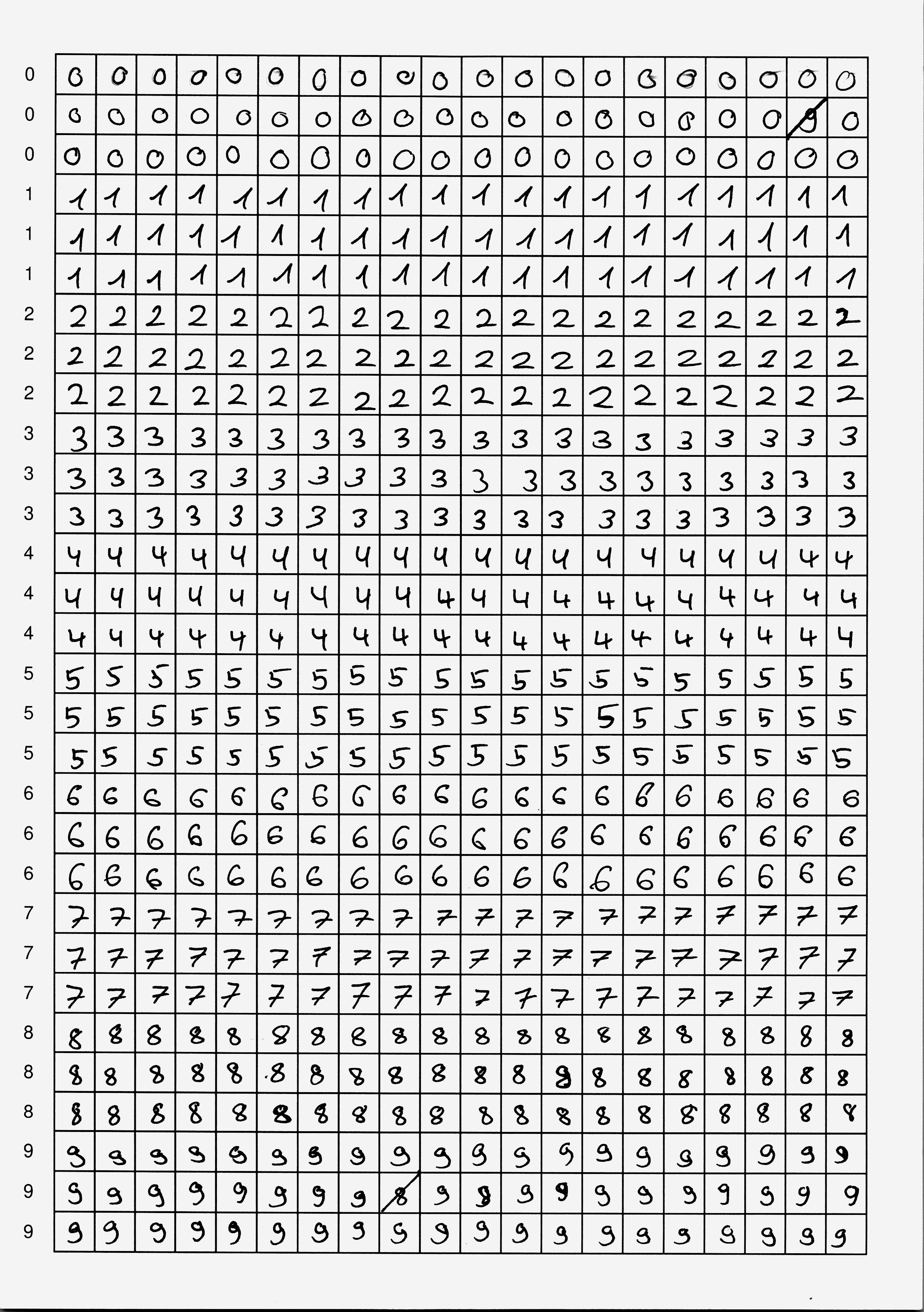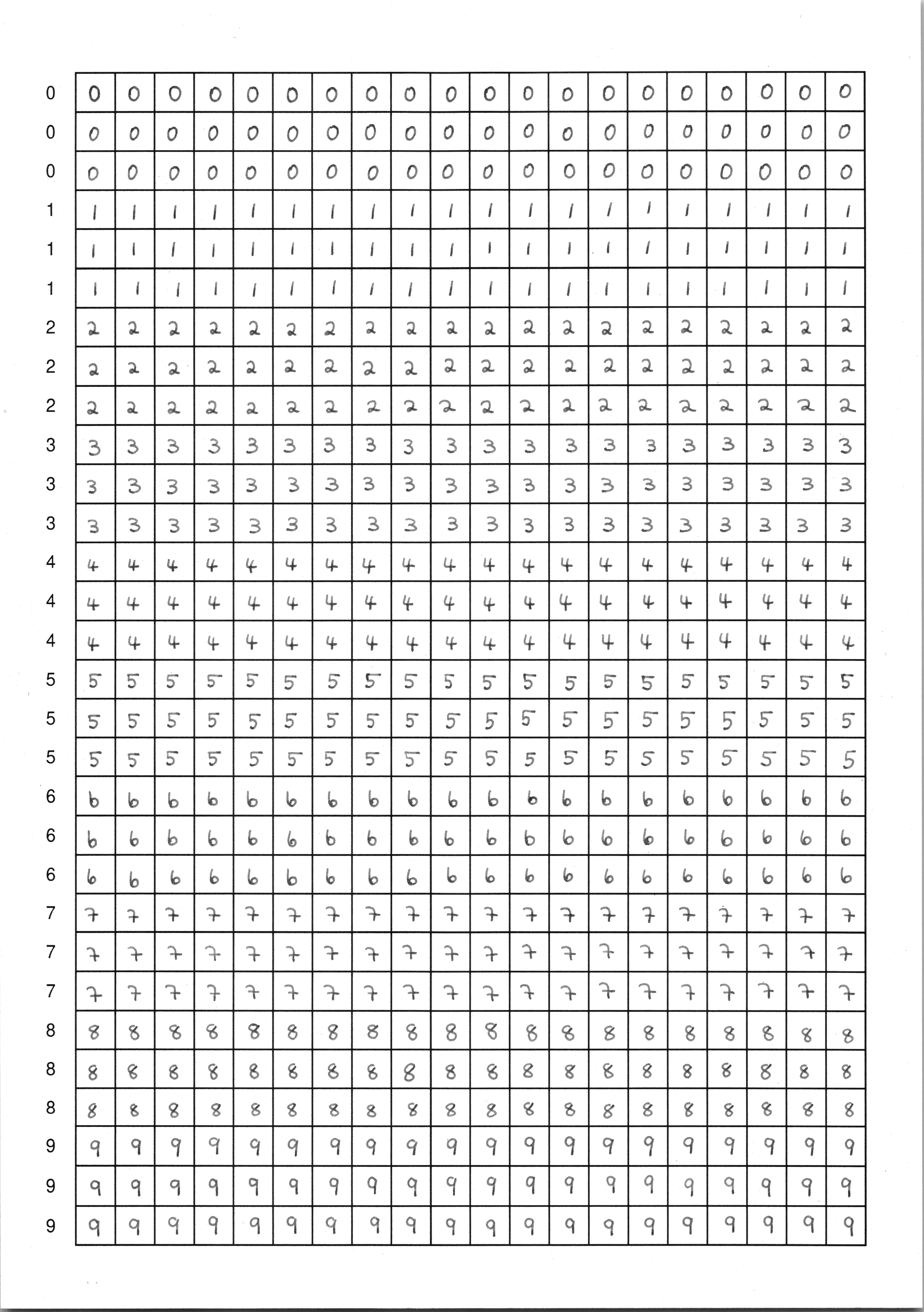 Du hast nun zwei Möglichkeiten: entweder verwendest du fertige Scans mit handgeschriebenen Ziffern, oder du schreibst selbst Ziffern – das ist natürlich viel spannender, weil du in diesem Fall dein neuronales Netzwerk mit deinen eigenen Daten trainieren wirst. In jedem Fall brauchst du mindestens zwei Seiten mit handgeschriebenen Ziffern als Trainingsmaterial.