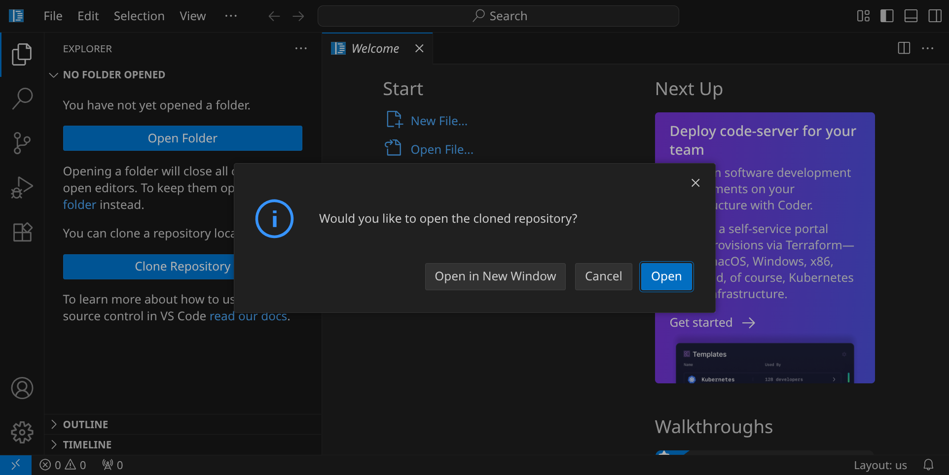 Beantworte die Frage »Would you like to open the cloned repository?« mit »Open«.