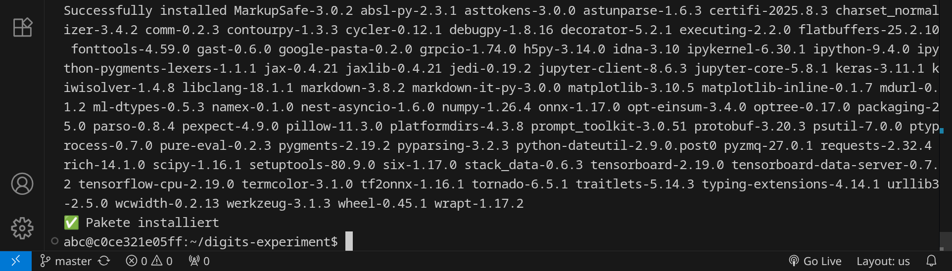Dieses Skript richtet eine Python-Umgebung ein und installiert die nötigen Pakete für das KI-Experiment. Dabei werden ca. 500 MB heruntergeladen und dein Verzeichnis ist danach ca. 2 GB groß (das ist aber in der Hackschule kein Problem). Wenn du den grünen Haken siehst, hat alles geklappt und du kannst das Terminal wieder schließen: