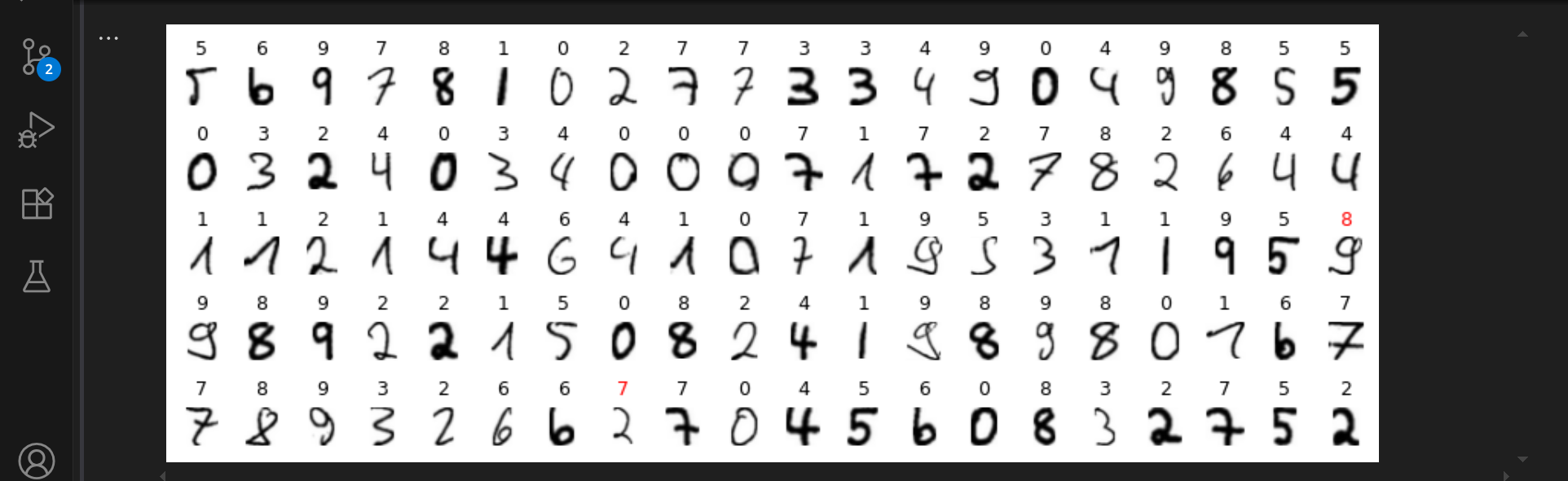 Die roten Ziffern markieren die falschen Vorhersagen. Das Modell ist noch nicht perfekt, aber es ist bereits in der Lage, handgeschriebene Ziffern zu erkennen.