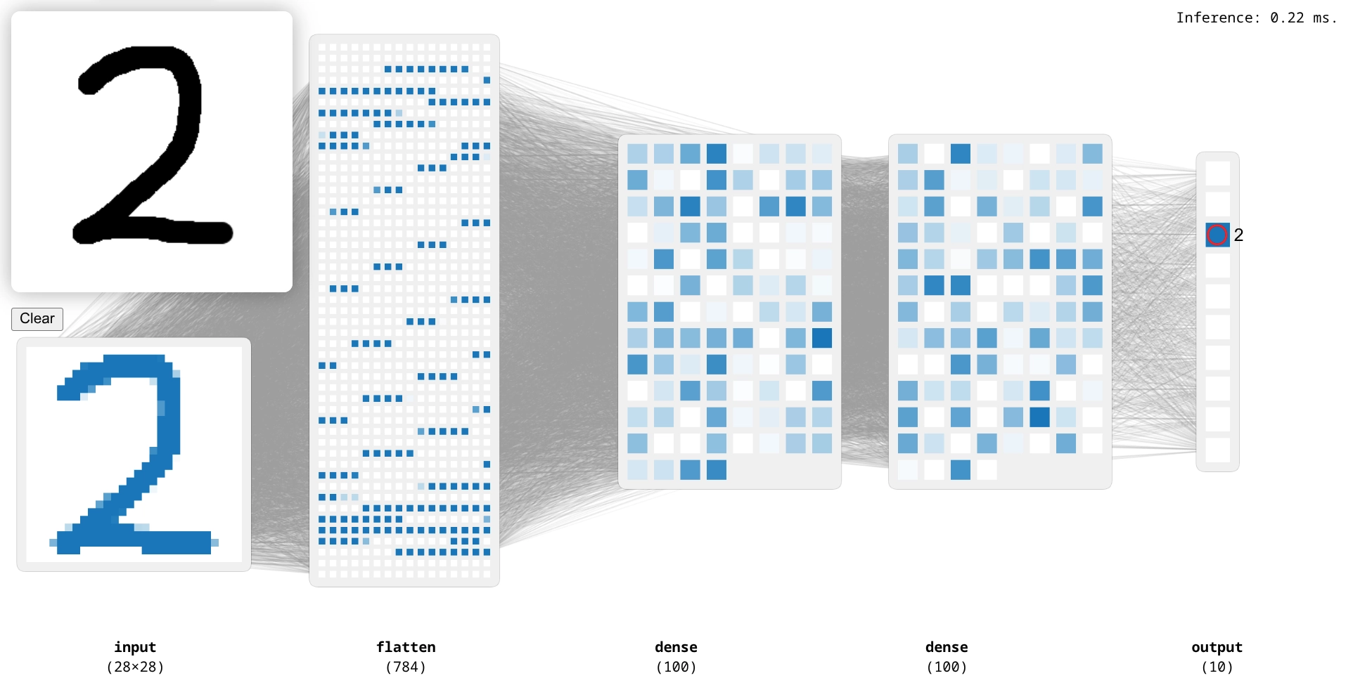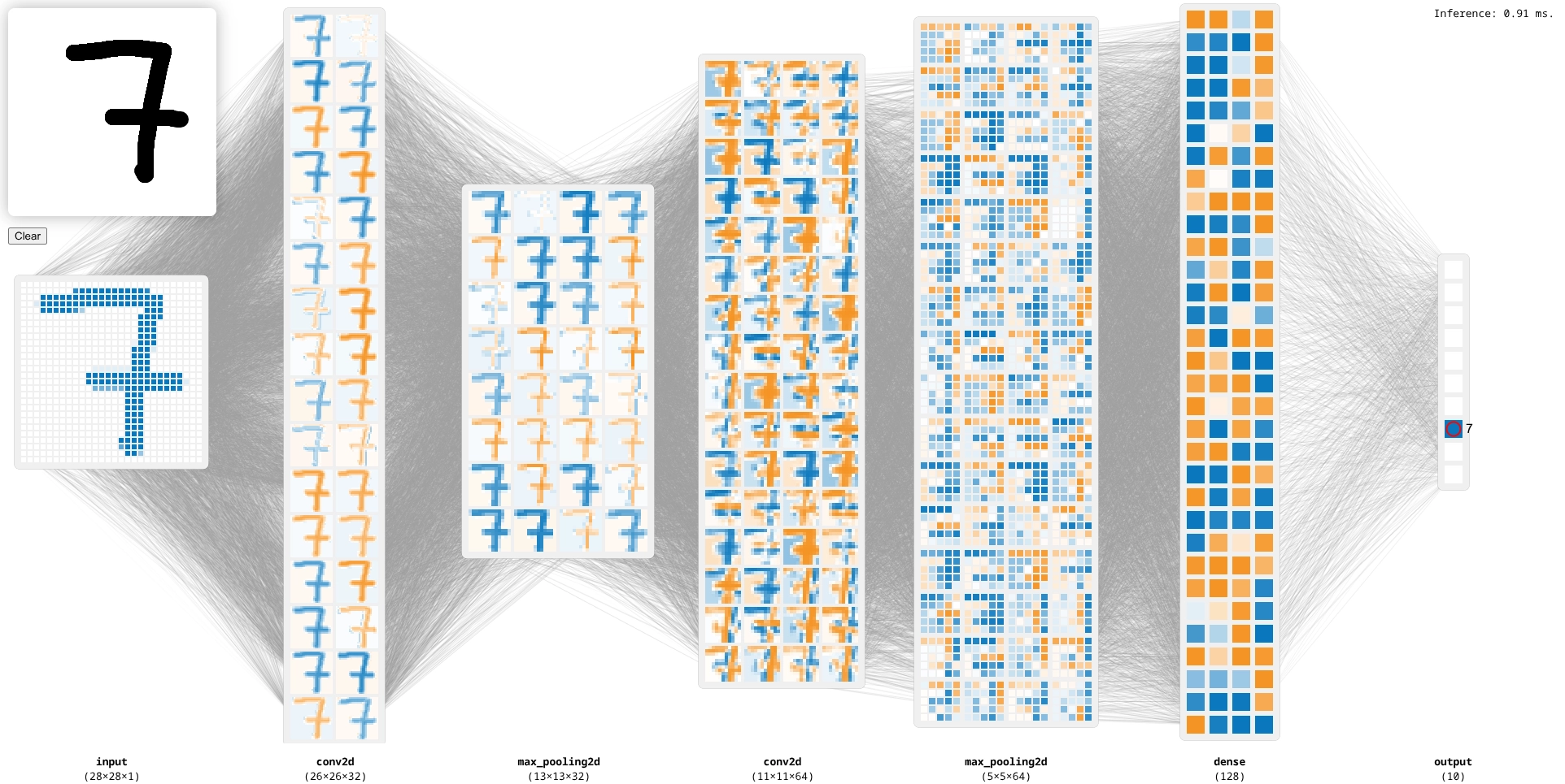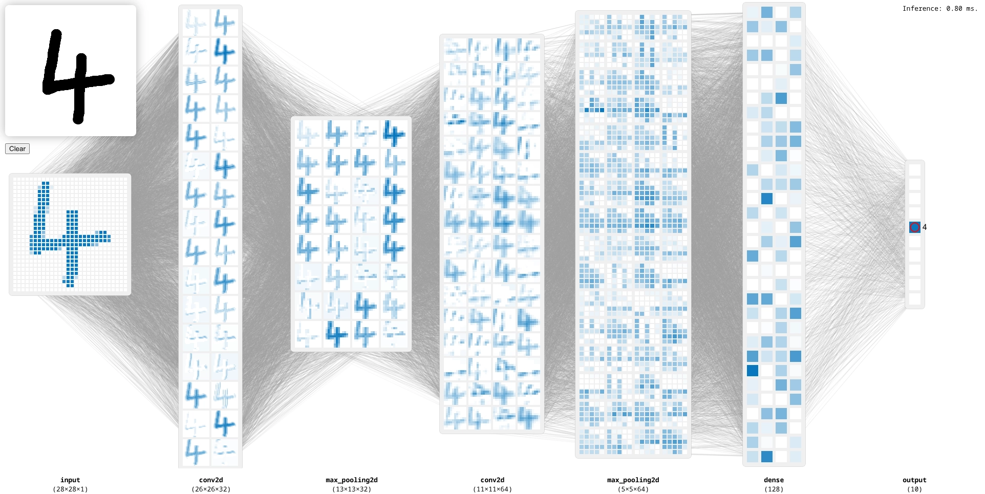 Wenn du das Modell im Webbrowser testest, siehst du, wie die Pixel nicht mehr im ersten Schritt voneinander getrennt werden, sondern über mehrere Schichten hinweg im Quadrat angeordnet gemeinsam behandelt werden: