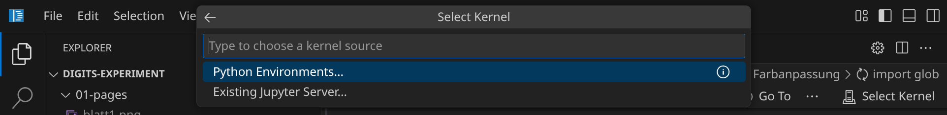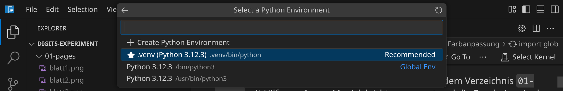 Bevor der Code ausgeführt werden kann, musst du noch einen Python-Interpreter auswählen. Bestätige die Auswahl »Python Environments« und »★ .venv (Python 3.12.3)«: