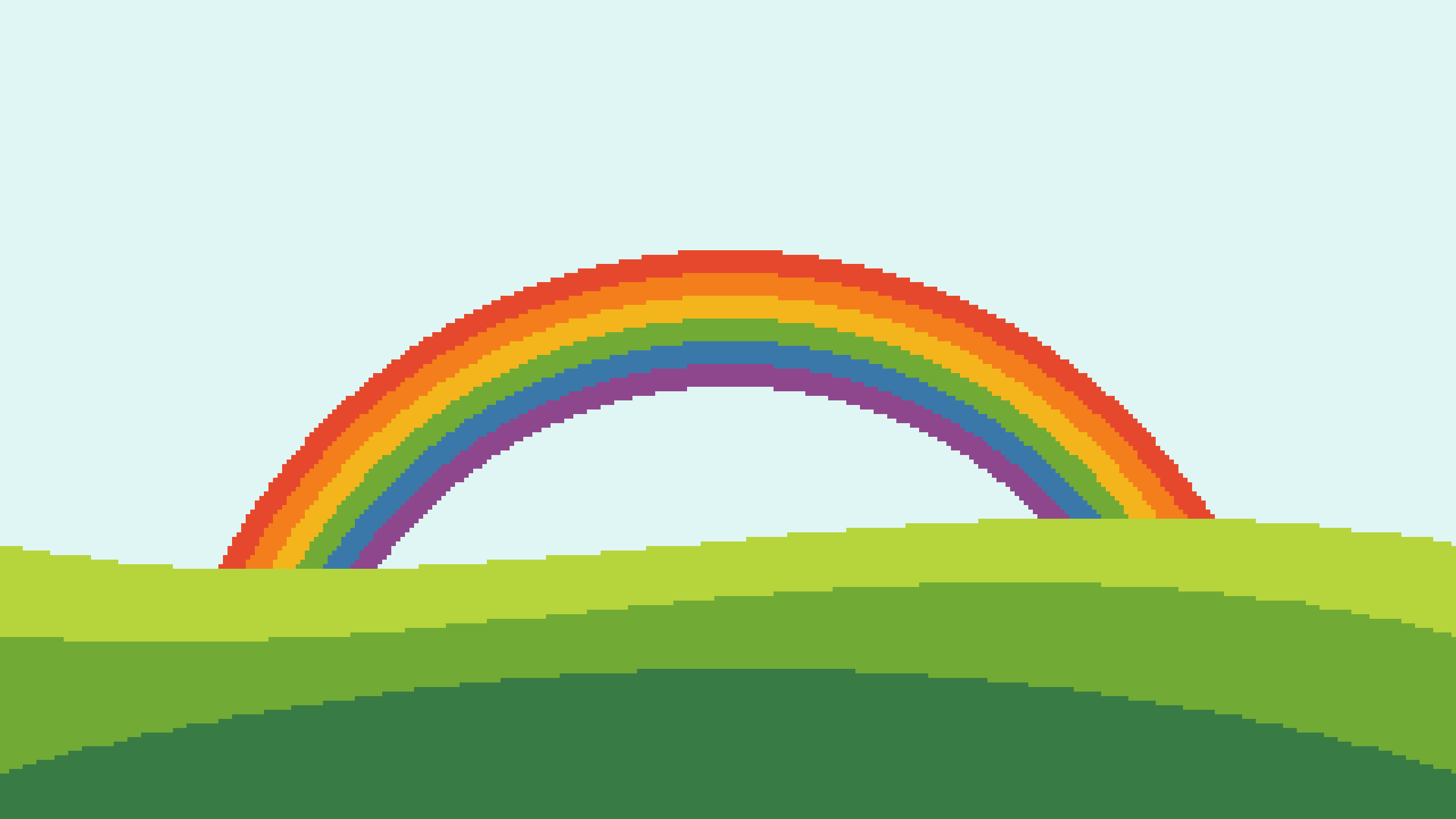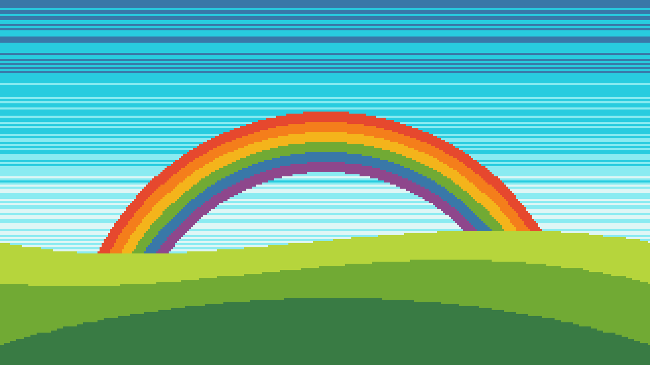 require 'pixelflow_canvas.rb' # Wir erstellen ein neues Pixelflow-Canvas mit einer # Größe von 320x180 Pixeln und wir möchten eine # Palette verwenden. canvas = Pixelflow::Canvas.new(320, 180, :palette) do # Wir wählen die Zughy-32-Palette set_predefined_palette(:zughy_32) # Hintergrund set_color(16) fill_rect(0, 0, 319, 179) # drei grüne Graskurven set_color(7) draw_cubic_bezier(0, 120, 100, 140, 200, 100, 320, 120) set_color(8) draw_cubic_bezier(0, 140, 100, 150, 200, 110, 320, 140) set_color(9) draw_cubic_bezier(0, 170, 110, 140, 220, 140, 320, 170) # Grasflächen füllen set_color(7) flood_fill(0, 130) set_color(8) flood_fill(0, 150) set_color(9) flood_fill(0, 179) # Maske setzen: nur noch Pixel setzen, # die die Farbe 16 (Hintergrund) haben set_mask do add_color(16) end # Regenbogen zeichnen r = 125 [28, 27, 26, 8, 19, 23, 16].each do |color| set_color(color) fill_circle(160, 180, r) r -= 5 end # Maske erneuern: nur noch Pixel setzen, # die jetzt die Farbe 16 (Hintergrund) haben set_mask do add_color(16) end # Himmel zeichnen: Verlauf von dunkelblau # nach hellblau (0...180).each do |y| set_color(20 - 3.5 * (y / 179.0) - rand() * 1.5) draw_line(0, y, 319, y) end # Maske aufheben remove_mask() # Bild speichern save_as_png("rainbow.png") end |