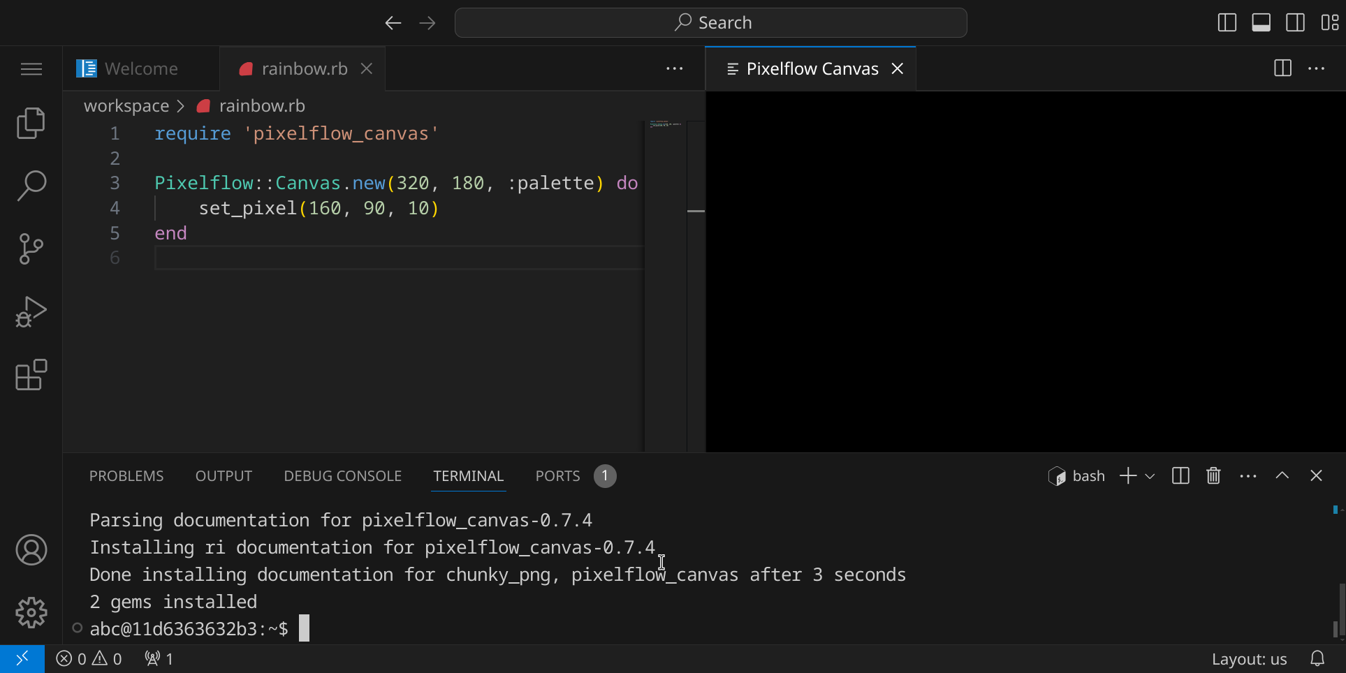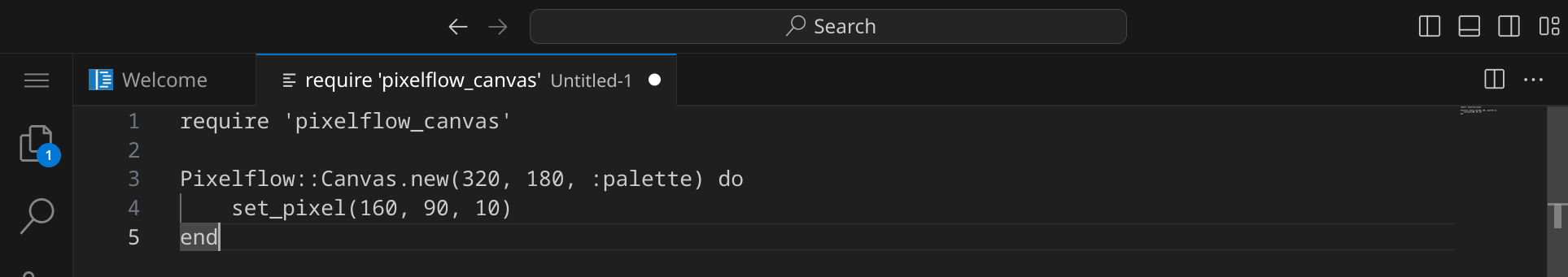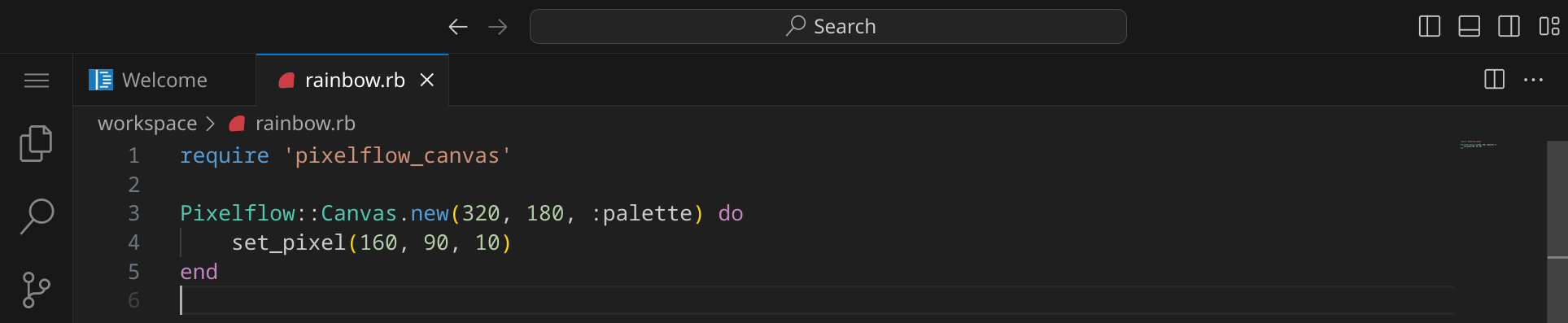 require 'pixelflow_canvas' Pixelflow::Canvas.new(320, 180, :palette) do set_pixel(160, 90, 10) end