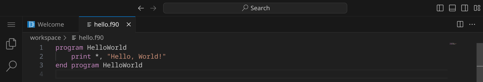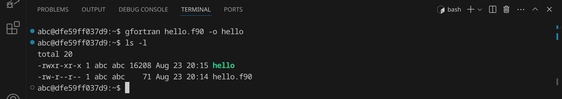 Drücke nun StrgS, um die Datei zu speichern. Gib hello.f90 ein – der vollständige Pfad zu deiner Datei lautet dann /workspace/hello.f90.