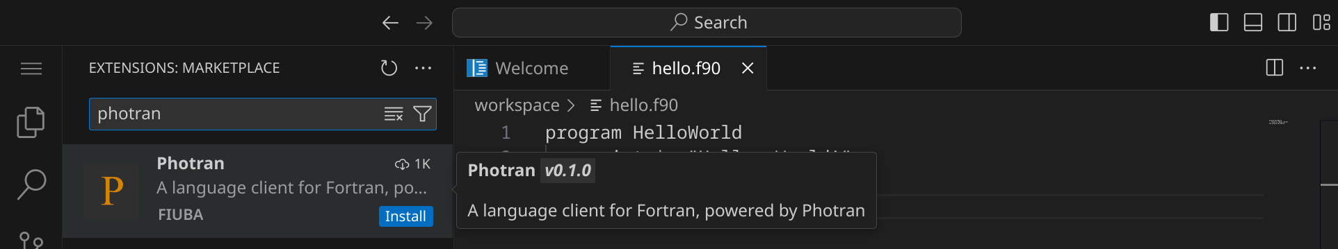 Alternativ kannst du auch StrgP drücken und ext install fiuba.photran-lsp-client-vscode eingeben, um die Erweiterung zu installieren.