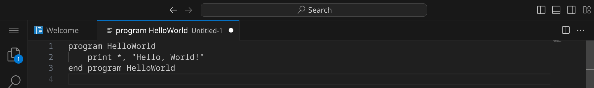 Da Visual Studio Code noch nicht weiß, dass es sich um Fortran-Quelltext handelt, ist dein Programm momentan noch einfarbig, aber das wird sich gleich ändern. An dem weißen Punkt erkennst du, dass deine Änderungen noch nicht gespeichert sind.