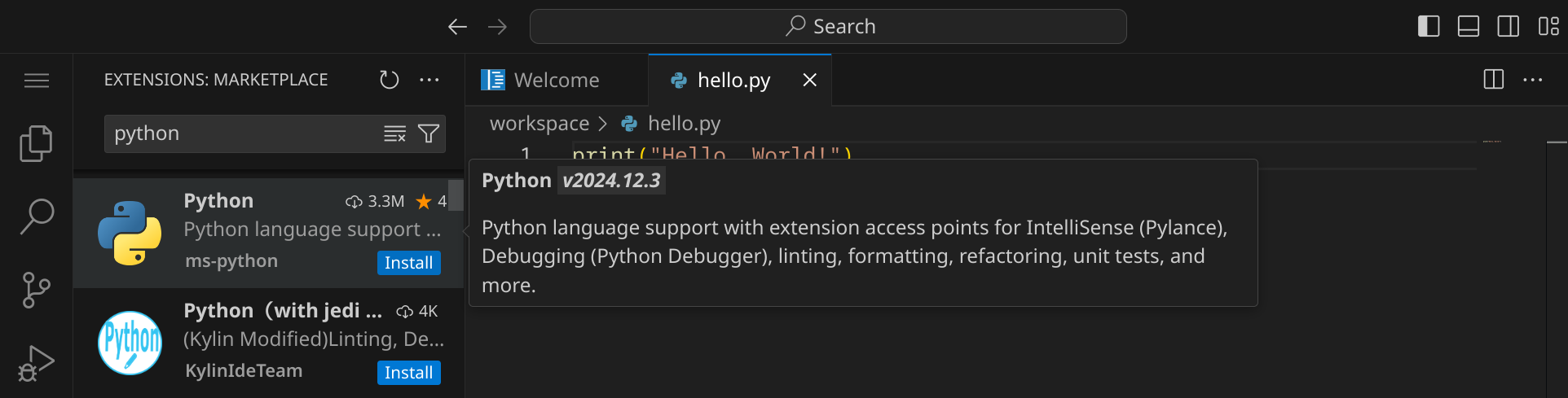 in der Seitenleiste und suche nach »Python«. Klicke auf »Install«, um die Erweiterung zu installieren.