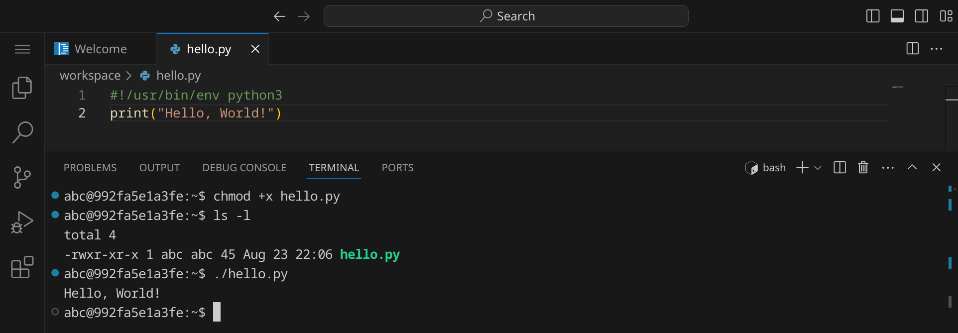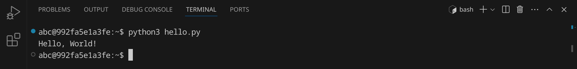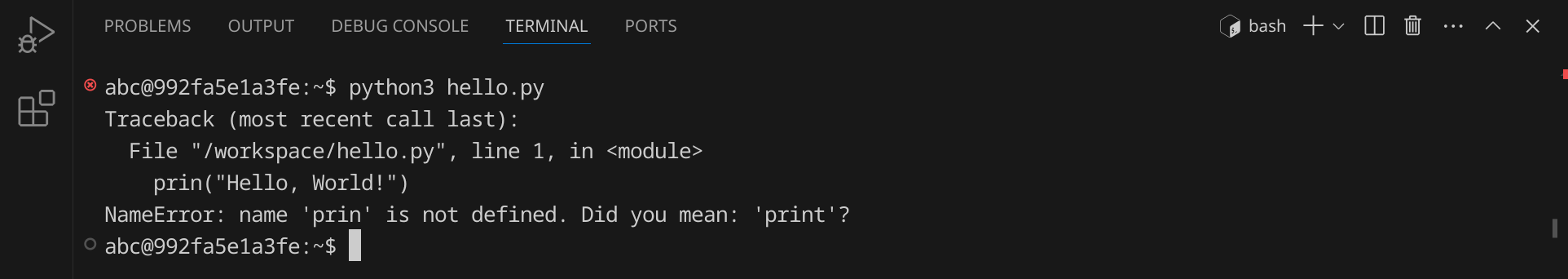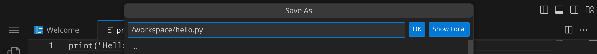 Drücke nun StrgS, um die Datei zu speichern. Gib hello.py ein – der vollständige Pfad zu deiner Datei lautet dann /workspace/hello.py.