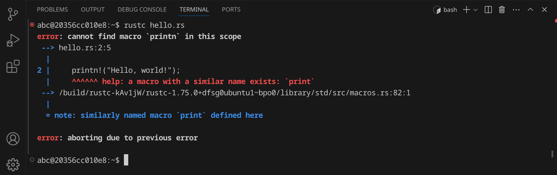 Drücke nun StrgS, um die Datei zu speichern. Gib hello.rs ein – der vollständige Pfad zu deiner Datei lautet dann /workspace/hello.rs.
