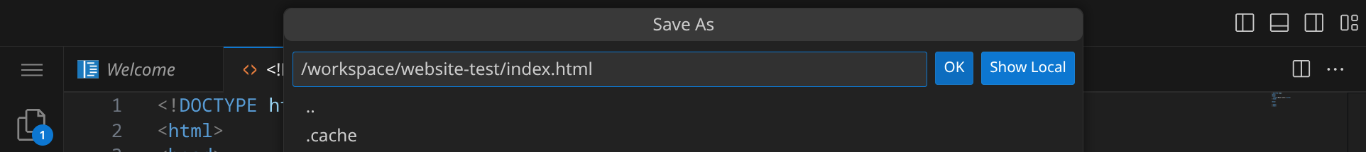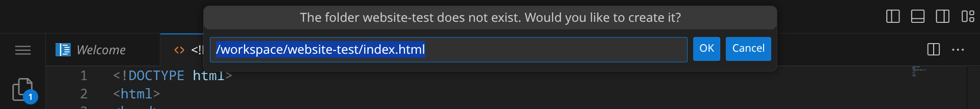 Drücke nun StrgS, um die Datei zu speichern. Gib website-test/index.html ein – der vollständige Pfad zu deiner Datei lautet dann /workspace/website-test/index.html.