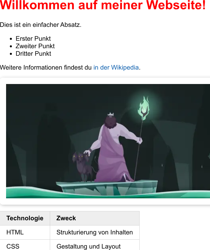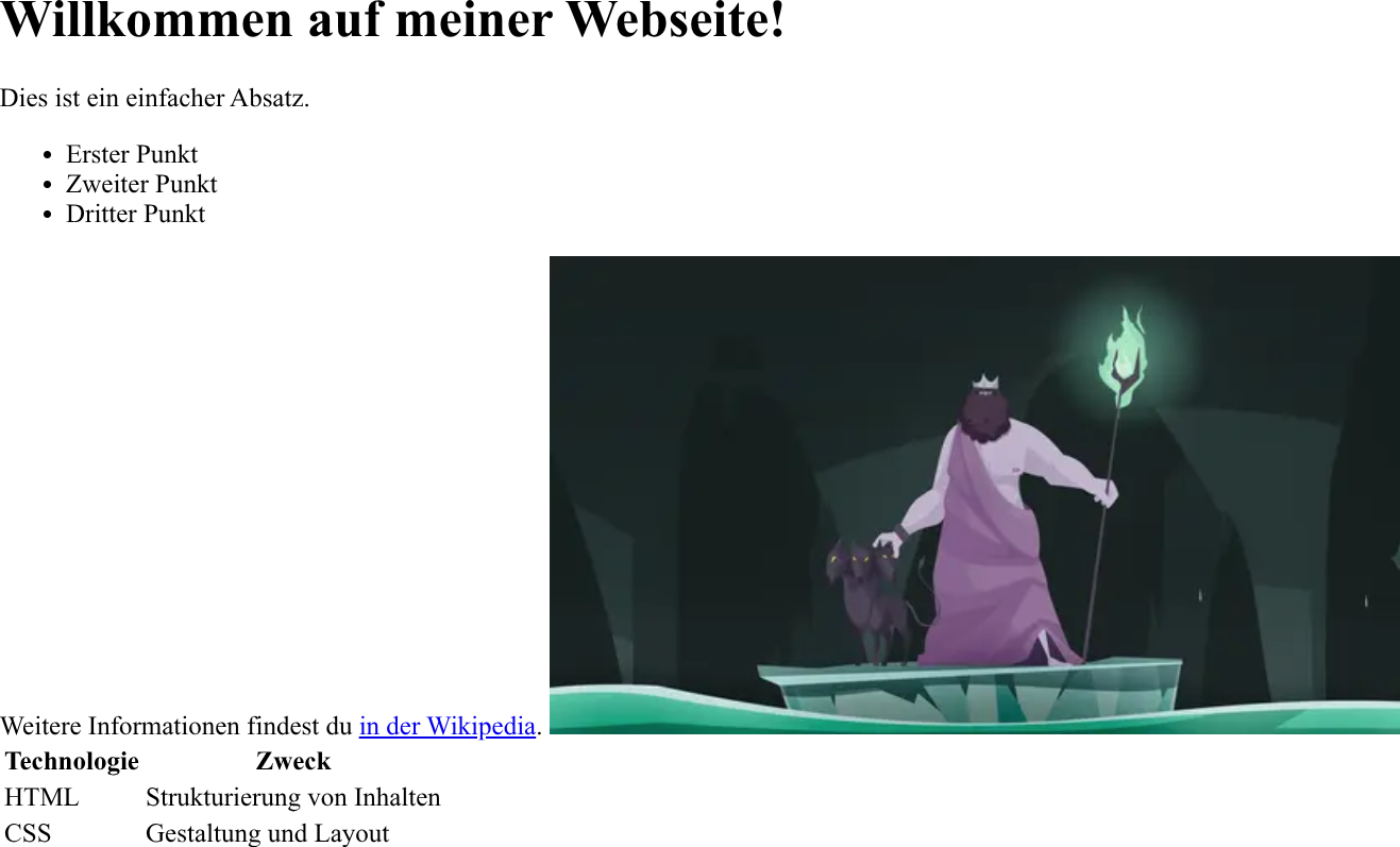 <!DOCTYPE html> <html> <head> <title>Meine erste Webseite</title> </head> <body> <h1>Willkommen auf meiner Webseite!</h1> <p>Dies ist ein einfacher Absatz.</p> <ul> <li>Erster Punkt</li> <li>Zweiter Punkt</li> <li>Dritter Punkt</li> </ul> <p> Weitere Informationen findest du <a href="https://de.wikipedia.org">in der Wikipedia</a>. </p> <img src="https://workspace.hackschule.de/cache/3afc860ed6aa2cb1-512.webp" alt="Hades in der Unterwelt"> <table> <tr> <th>Technologie</th> <th>Zweck</th> </tr> <tr> <td>HTML</td> <td>Strukturierung von Inhalten</td> </tr> <tr> <td>CSS</td> <td>Gestaltung und Layout</td> </tr> </table> </body> </html>