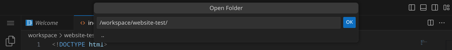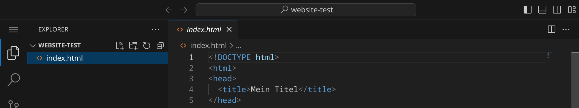 Da wir nun in diesem Verzeichnis arbeiten wollen, kannst du es öffnen, indem du entweder im Menü »File« / »Open Folder…« auswählst oder einfach StrgK und dann StrgO drückst. Wähle den Ordner website-test aus: