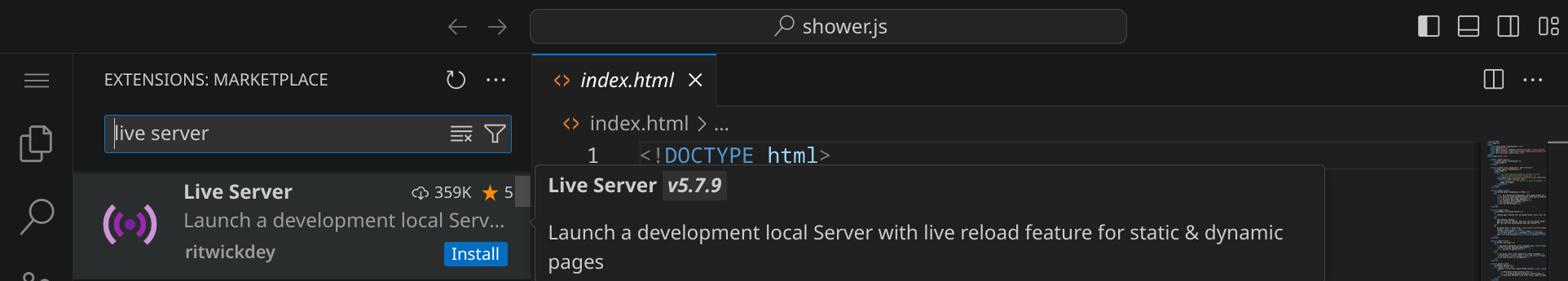 Damit wir unsere Webseite jederzeit im Browser anschauen können, installieren wir eine Erweiterung. Öffne dazu links die Extensions, suche die Erweiterung »Live Server« und klicke auf »Install«, um die Erweiterung zu installieren: