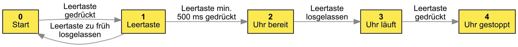 Wenn der Zustand 0 ist, wird er auf 1 gesetzt und ein Timeout von 500 ms gestartet. Am Ende dieses Timeouts wird geschaut, ob der Zustand immer noch 1 ist. Wenn ja, wird er auf 2 gesetzt und die Klasse ready zur Timeranzeige hinzugefügt. Diese Klasse sorgt dafür, dass die Stoppuhr grün wird.