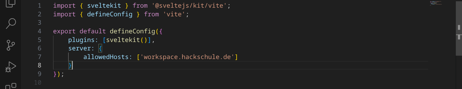 Öffne nun die Datei vite.config.js und füge einen Eintrag server hinzu, um den Server für Anfragen aus deinem Workspace zu öffnen: