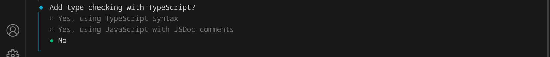Bei der nächsten Frage wäre die richtige Antwort »TypeScript«, aber da wir in diesem Tutorial kein TypeScript verwenden, sondern normales JavaScript, wähle hier bitte »No« aus: