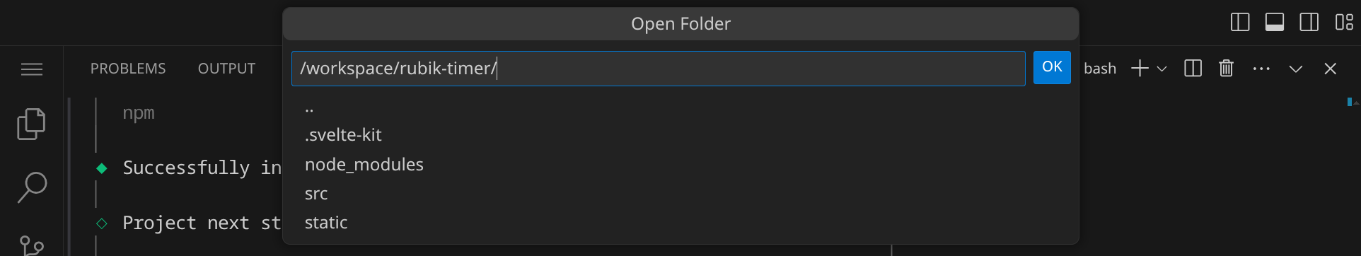 Öffne nun das Verzeichnis, indem du entweder im Menü »File« / »Open Folder…« auswählst oder einfach StrgK und dann StrgO drückst. Wähle den Ordner rubik-timer aus: