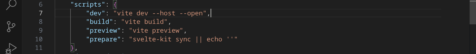 Bevor wir den Entwicklungs-Server im Workspace starten können, müssen wir noch eine Kleinigkeit anpassen. Öffne die Datei package.json und ändere den Eintrag für "dev" von "vite dev" in "vite dev --host --open".