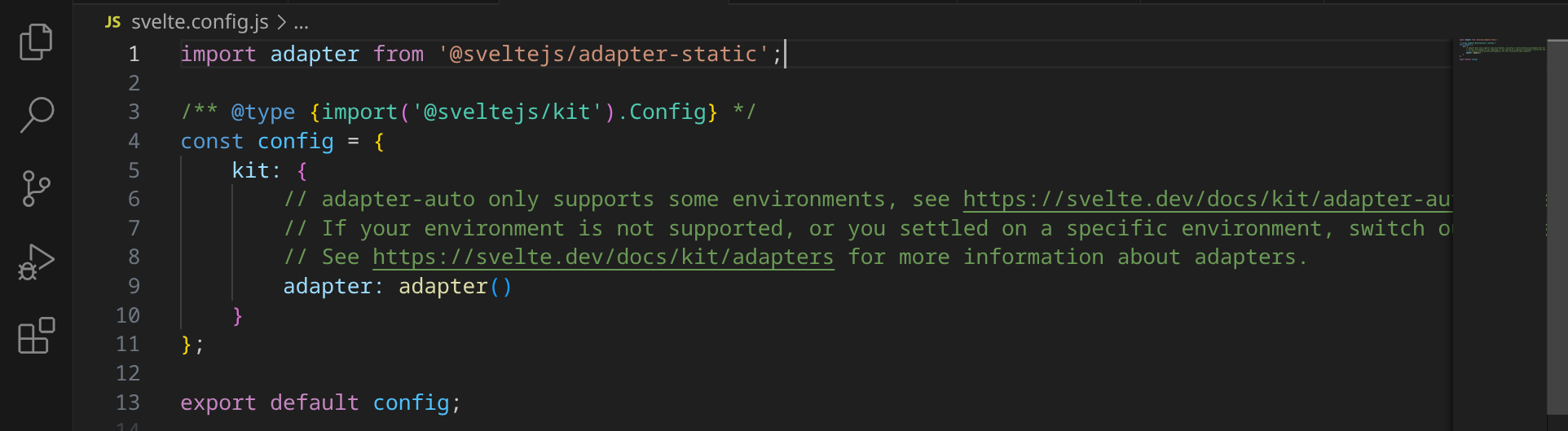 Anschließend musst du den Adapter in der Datei svelte.config.js aktivieren. Öffne die Datei und ändere adapter-auto in adapter-static: