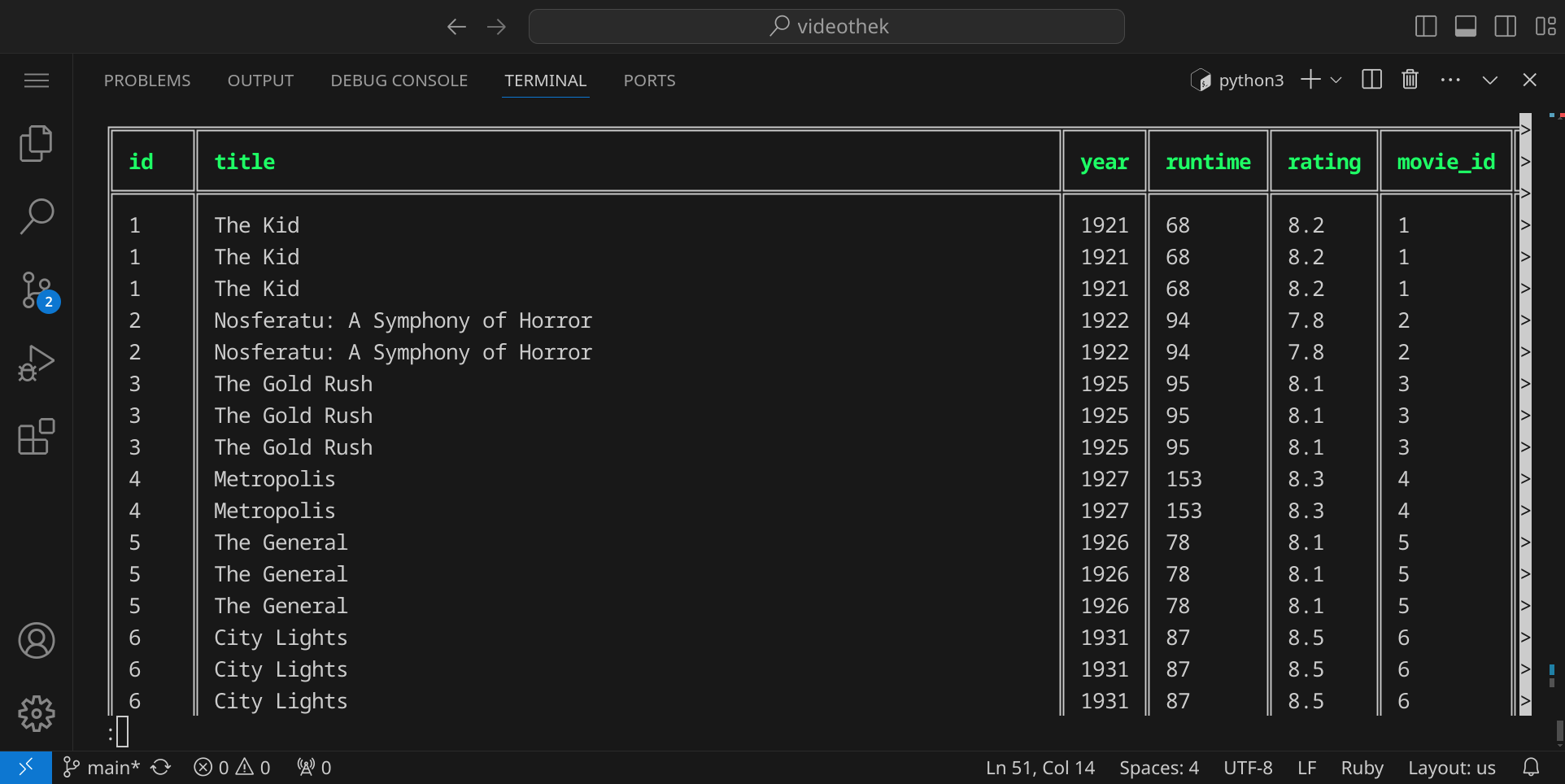 Unsere Abfrage ist nun also fertig und wir können sie in unser Ruby-Programm einfügen. Öffne dazu die Datei videothek.rb und ändere den Code in Zeile 51 wie folgt: