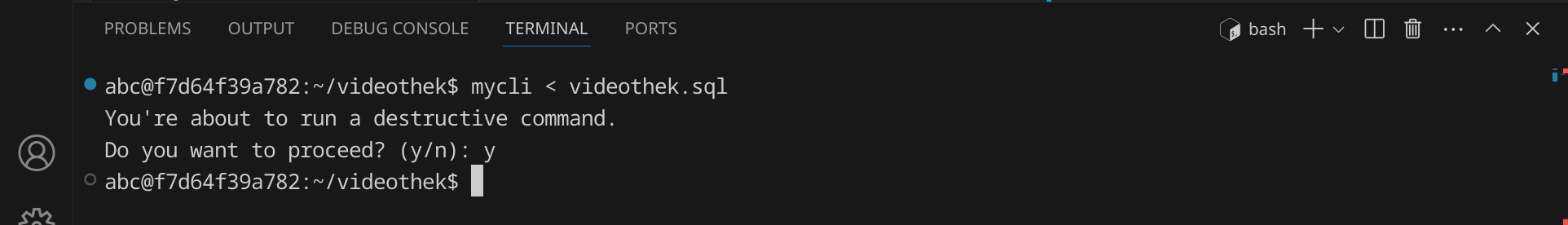 Erweitere außerdem bei der Gelegenheit gleich die Tabelle movie um die Spalte german_title. Exportiere das SQL-Schema erneut als videothek.sql, setze deine Datenbank zurück und gib die Datei an mycli: