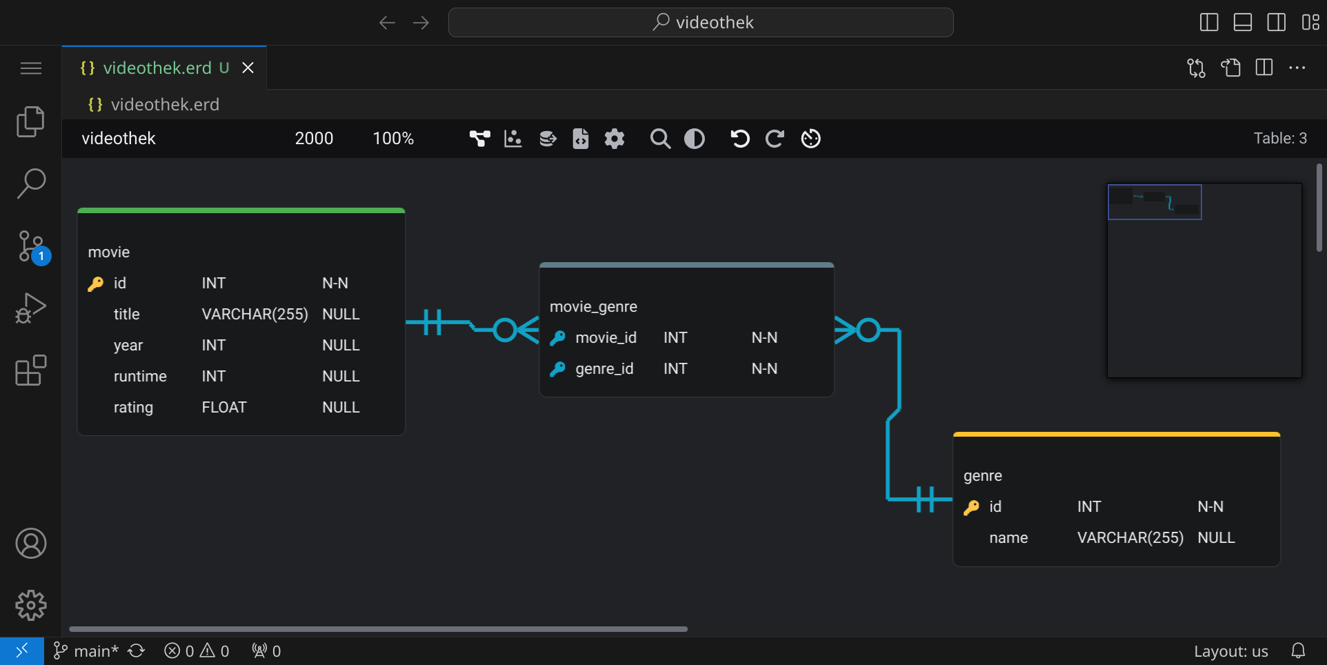 _).movie_genre entstehen automatisch, wenn du die Beziehung zwischen den Tabellen movie und genre herstellst (Fremdschlüssel sind pink markiert).id heißen, musst du sie in movie_id und genre_id umbenennen, damit es keine Verwechslungen gibt.movie_genre zusätzlich als Primärschlüssel, sie sollten dann blau dargestellt werden.N-N steht für »NOT NULL« und bedeutet, dass der Wert nicht leer sein darf.Wenn du fertig bist, kannst du das Diagramm speichern und den SQL-Code exportieren, den wir später verwenden werden, um die Datenbankstruktur zu erstellen. Klicke dazu mit rechts auf den Hintergrund und wähle »Export« / »Schema SQL«.